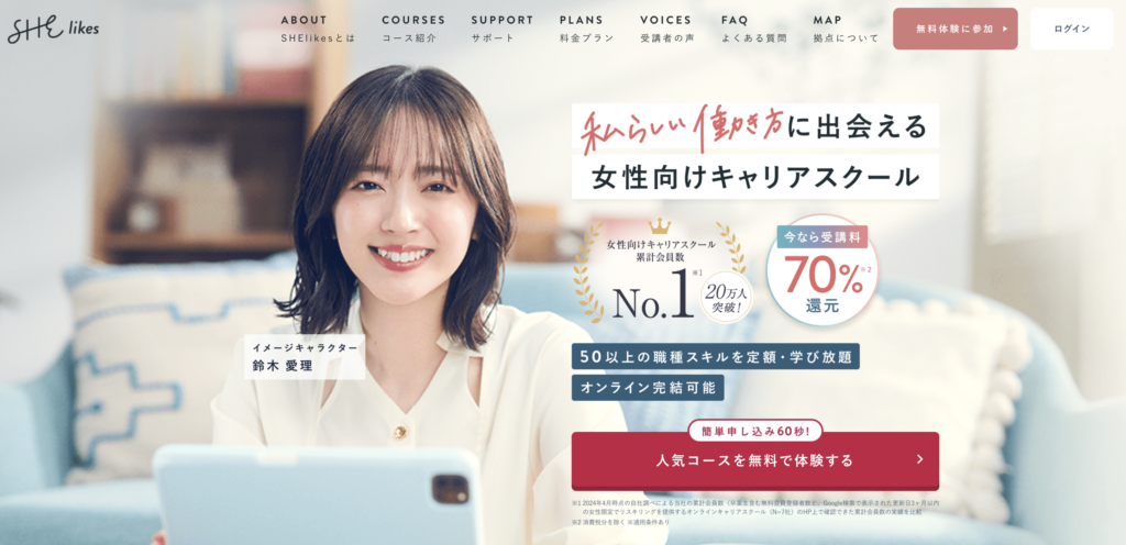 SHElikesは、女性向けに特化したキャリアスクールで、特に20代〜30代女性から高い支持を集めています。Webデザイン、ライティング、マーケティング、動画編集など、全45以上の職種スキルを定額制で学べるのが大きな特徴です。月額制のため、複数スキルを横断して学べる柔軟性があり、「自分に合った仕事を見つけたい」という方に最適です。また、コミュニティ機能が充実しており、同じ目標を持つ仲間とつながれる環境がモチベーション維持に大きく貢献します。さらに、コーチングやキャリアサポートもあり、学習だけで終わらず「働き方の変化」まで支援してくれる点が魅力です。