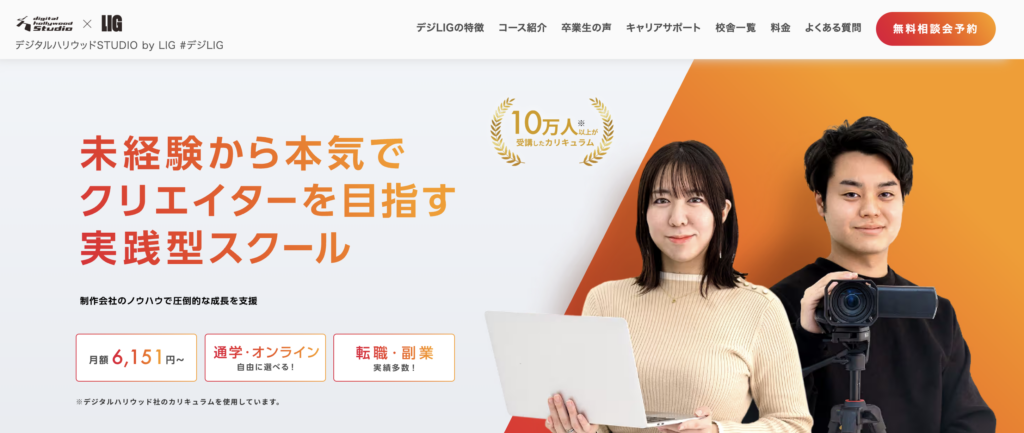 デジタルハリウッドSTUDIO by LIGは、制作会社LIGが運営する実践型Webスクールです。Webデザインや動画制作を中心に、現場で通用するスキルを身につけられるカリキュラムが特徴です。講師は現役クリエイターが担当しており、リアルな制作ノウハウや業界の最新トレンドを学べます。また、ポートフォリオ制作にも力を入れており、転職や案件獲得に直結するアウトプットができる点が魅力です。校舎での学習とオンラインの併用が可能で、自分のペースに合わせて学べる柔軟性もあります。本気でクリエイティブ職を目指す方におすすめのスクールです。