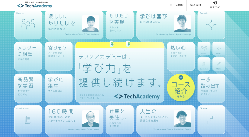 TechAcademyは、完全オンラインで受講できるプログラミング・Webスキルスクールです。現役エンジニアによるマンツーマンメンタリングが特徴で、初心者でも挫折しにくい仕組みが整っています。Webデザイン、フロントエンド、AI、動画編集など幅広いコースがあり、目的に応じて選択可能です。チャットサポートは毎日対応しており、疑問をすぐに解消できる点も魅力です。また、副業案件の紹介や転職支援もあり、学習後のキャリア形成までサポートしてくれます。忙しい社会人でもスキマ時間で効率よく学べるのが強みです。