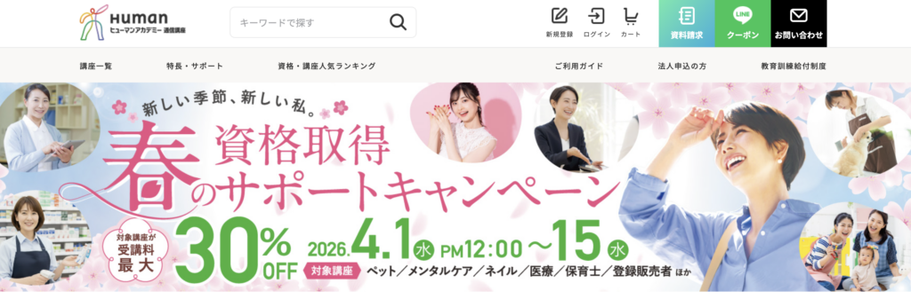 ヒューマンアカデミー通信講座は、自宅で学べる通信教育サービスです。通学が難しい方や、自分のペースで学びたい方に適しており、Webデザイン、医療事務、ネイル、心理学など幅広い講座が用意されています。教材の質が高く、初心者でも理解しやすい構成になっている点が特徴です。また、サポート体制も整っており、質問対応や添削指導を受けながら着実にスキルを身につけることができます。価格も比較的リーズナブルで、初めて学習する方の入門としても人気があります。