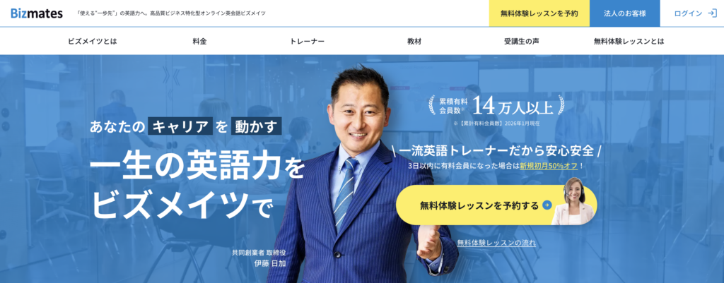 ビズメイツは、ビジネス英語に特化したオンライン英会話として圧倒的な支持を集めています。採用されている講師は全員ビジネス経験者であり、実際のビジネスシーンに即した英語を学べる点が最大の強みです。